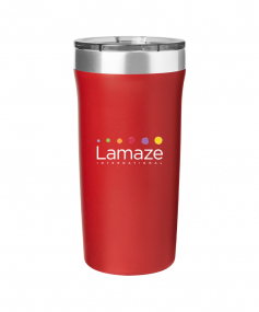 18 oz double wall 18/8 stainless steel thermal tumbler with vacuum insulation, brushed stainless steel rim, clear push-on acrylic lid with sliding closure, and powder coated finish. Hand wash recommended. Do not microwave. Complies with FDA, Prop 65. 7.25" H x 3.5" W