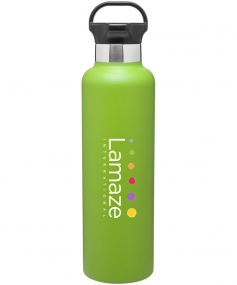 24 oz powder coated double wall 18/8 stainless steel thermal bottle with copper vacuum insulation, threaded gear-shaped insulated lid and carrying handle Complies with FDA, Prop 65. 11.25" H x 3" W