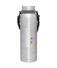 32 oz double wall 18/8 stainless steel thermal bottle with copper vacuum insulation, insulated stainless steel threaded lid, silicone ring, removable strap with buckles, removable clasps, and powder coated finish. Individual gift box. Hand wash recommended. Do not microwave. Complies with FDA, Prop 65. 11" H x 3.1875" W