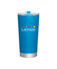 20 oz double wall 18/8 stainless steel thermal tumbler with vacuum insulation, and clear acrylic push-on swivel lid. Hand wash recommended. Do not microwave. Complies with FDA, Prop 65. 7.125" H x 3.75" W