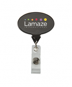 Oval design features rotating alligator clip for universal use. 30" sturdy nylon retracting cord and strong snap lock. Rotating alligator clip on back.